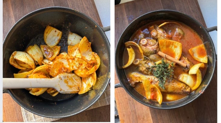 Preheat the oven to 325°F. In the same pot, add the onions and garlic from the marinade and let them cook down for a few minutes, stirring occasionally. Then, stir in the tomato paste and cook for another minute or two until it deepens in color.