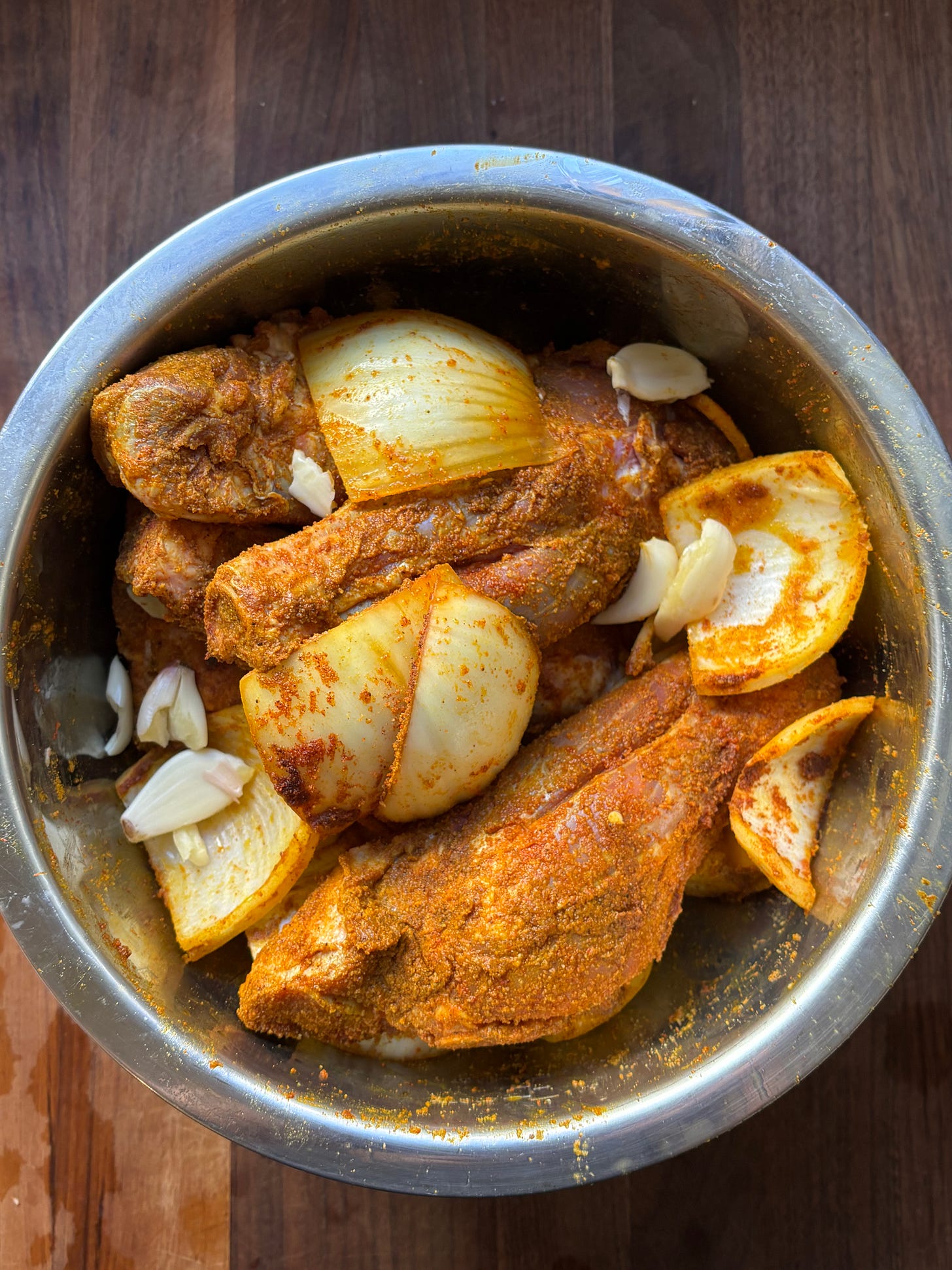 Start by seasoning the lamb shanks with salt and pepper and trimming a bit of the fat off each shank. Then massage in the curry powder, smoked paprika, ground ginger, onion powder, garlic powder, and ground cloves. Toss in the chopped onion, garlic, and ginger, then drizzle with olive oil and mix everything together until the lamb is fully coated. Cover and let it marinate in the fridge overnight.